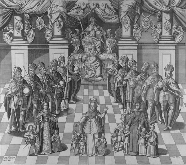 Abb. 4: Matthias Burglechner, 1641: Die Habsburgerinnen als Fortsetzerinnen des Hauses, Kupferstich, Österreichische Nationalbibliothek Wien, Bildarchiv