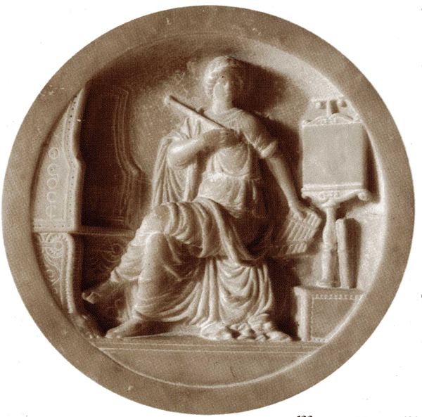 Abb. 2: Gian Cristoforo Romano (zugeschrieben): Die Muse Euterpe. Marmormedaillon in der Tür zum Eingang der Grotta der Isabella d'Este Gonzaga, Mantova, Palazzo Ducale, Corte vecchia. Rechts der Euterpe, von Betrachterseite aus links, ist ein mit musikalischen Mensurzeichen dekorierten Thron zu sehen, auf dem eine Krone abgelegt ist. Mit freundlicher Genehmigung des Ministero per i beni e le attività culturali, sopraintendenza per i beni storici artistici ed etnoantropologici per le provincie di Mantova, Brescia e Cremona.