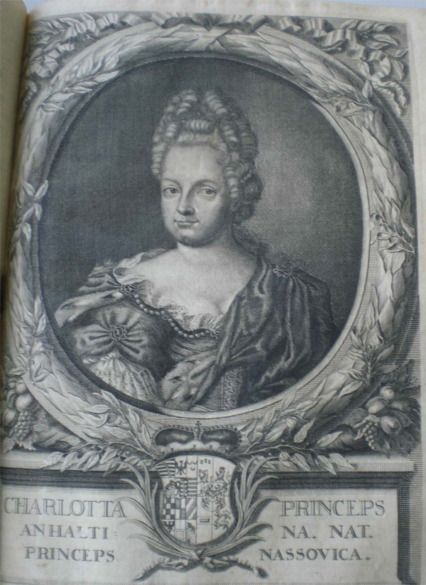 Abb. 1: Charlotte von Nassau-Dillenburg-Schaumburg (Kupferstich aus: Johann Christoph Beckmann: Historie des Fürstenthums Anhalt, Zerbst 1710)