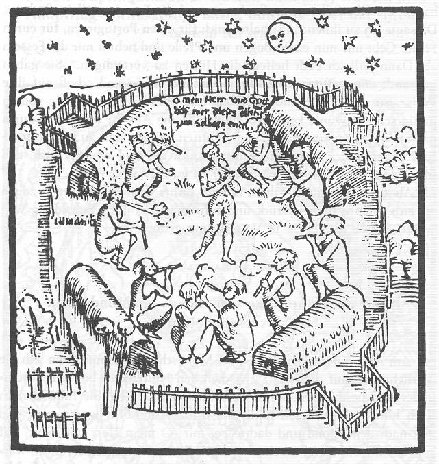 Abb. 1: Tabakkonsum unter Indios in Brasilien, Holzschnitt aus: Hans Staden: Warhaftige Historia vnd beschreibung eyner Landtschafft der Wilden / Nacketen / Grimmigen Menschenfresser Leuthen / in der Newenwelt America gelegen / vor vnd nach Christi geburt im Land zuo Hessen vnbekant […], Marburg 1557, 38v.