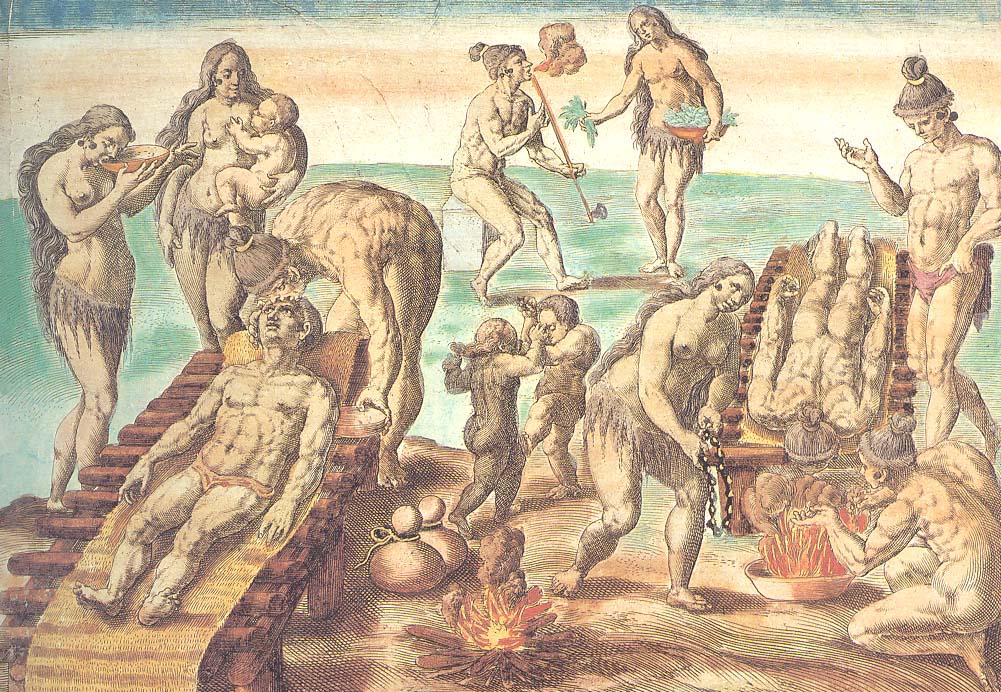 Abb. 3: "Welcherley Gestalt sie ihre Krancken zu heylen pflegen", kolorierter Kupferstich aus: Theodor de Bry: Warhafftige Abconterfaytung der Wilden in America / so daselbst erstlichen lebendiger weise abgerissen / von Jacob le Moyne / oder Morges genannt. Jetzt aber in Kupffer gestochen / vnd an Tag gegeben / durch Dieterich von Bry, [als Anhang] in: Theodor de Bry (Hg.): Der ander Theil / der Newlich erfundenen Landtschafft Americae, Von dreyen Schiffahrten / so die Frantzosen in Floridam (die gegen Nidergang gelegen) gethan. Eine vnter dem Hauptmann H. Laudonniere, Anno 1564. Die ander vnter H. Ribald 1565. Die dritte / vnter H. Guerguesio 1567. geschehen […], Frankfurt a.M., 1. Aufl. 1591, Neudruck 1603, [60 Bll.], hier: Tafel XX.