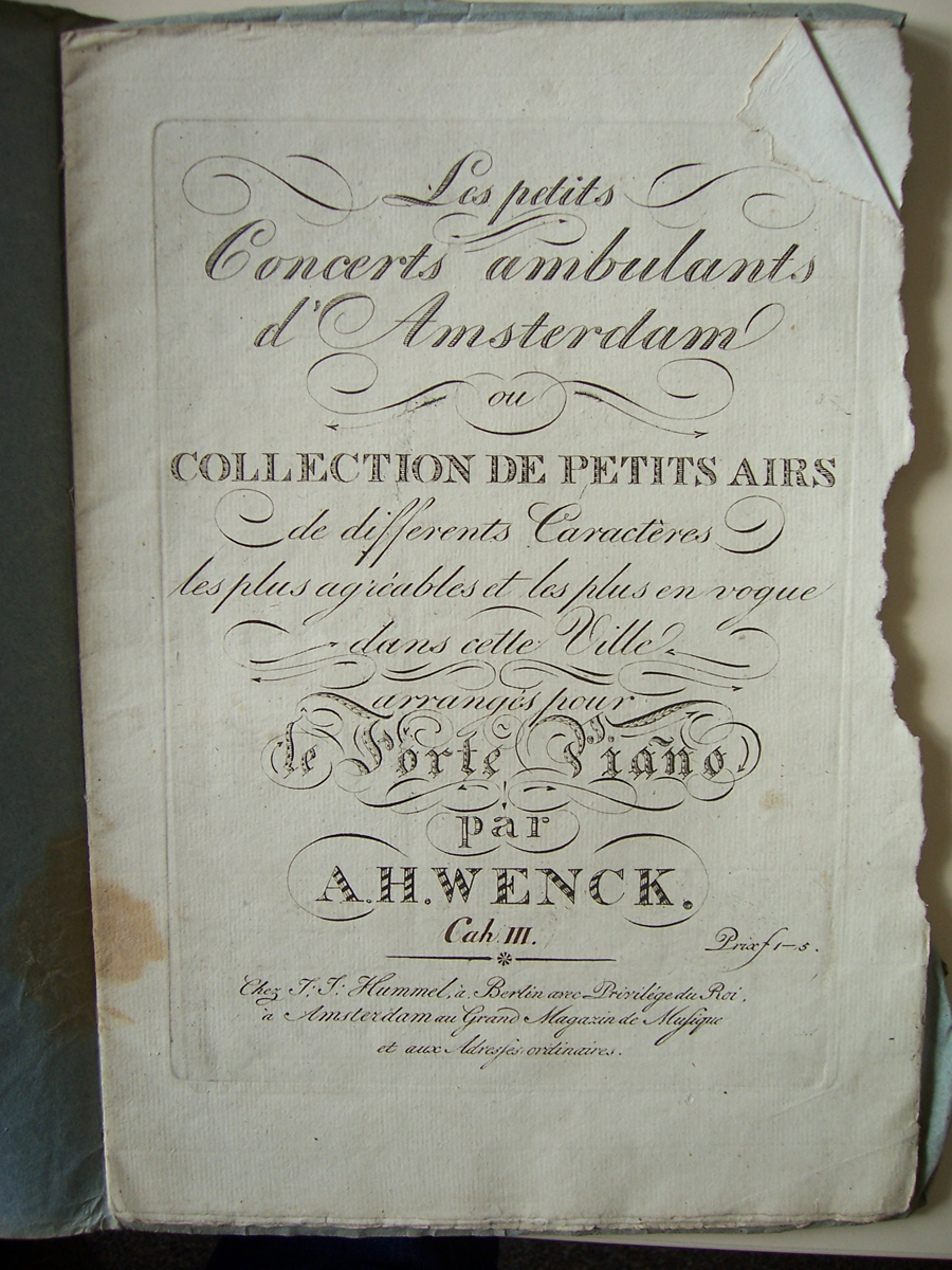 Abb. 2: Les petits Concerts ambulants d'Amsterdam ou Collection des Petits Airs de differents Caractères, les plus agréables et les plus en vogue dans cette ville, arrangés pour de Forte Piano par A.H. Wenck, Cah. III. Druck: J.J. Hummel, Berlin, ohne Datum. Besitzvermerk an anderer Stelle: "von Fürstenberg - Neheim", Archiv Schloss Stammheim. Bild und Foto: Privatbesitz
