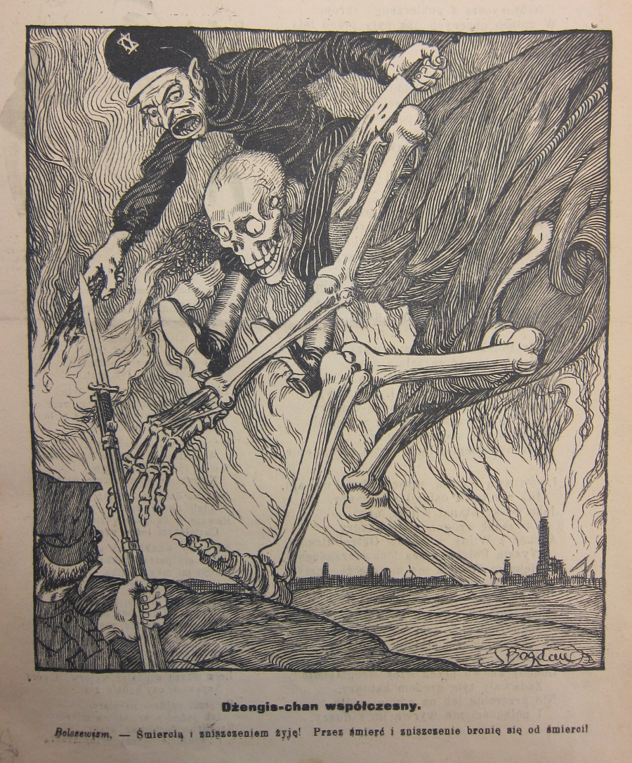 Abb. 8: "Dżengis-chan współczesny. Bolszwiszm. – Śmiercią i zniszczeniem żyję! Przez śmierć i zniszczenie bronię się od śmierci!" (Der moderne Dschingis Khan. Bolschewismus. – Durch Tod und Zerstörung lebe ich! Durch Tod und Zerstörung schütze ich mich vor dem Tod!). Karikatur; Quelle: Mucha, Nr. 30 vom 23. Juli 1920.