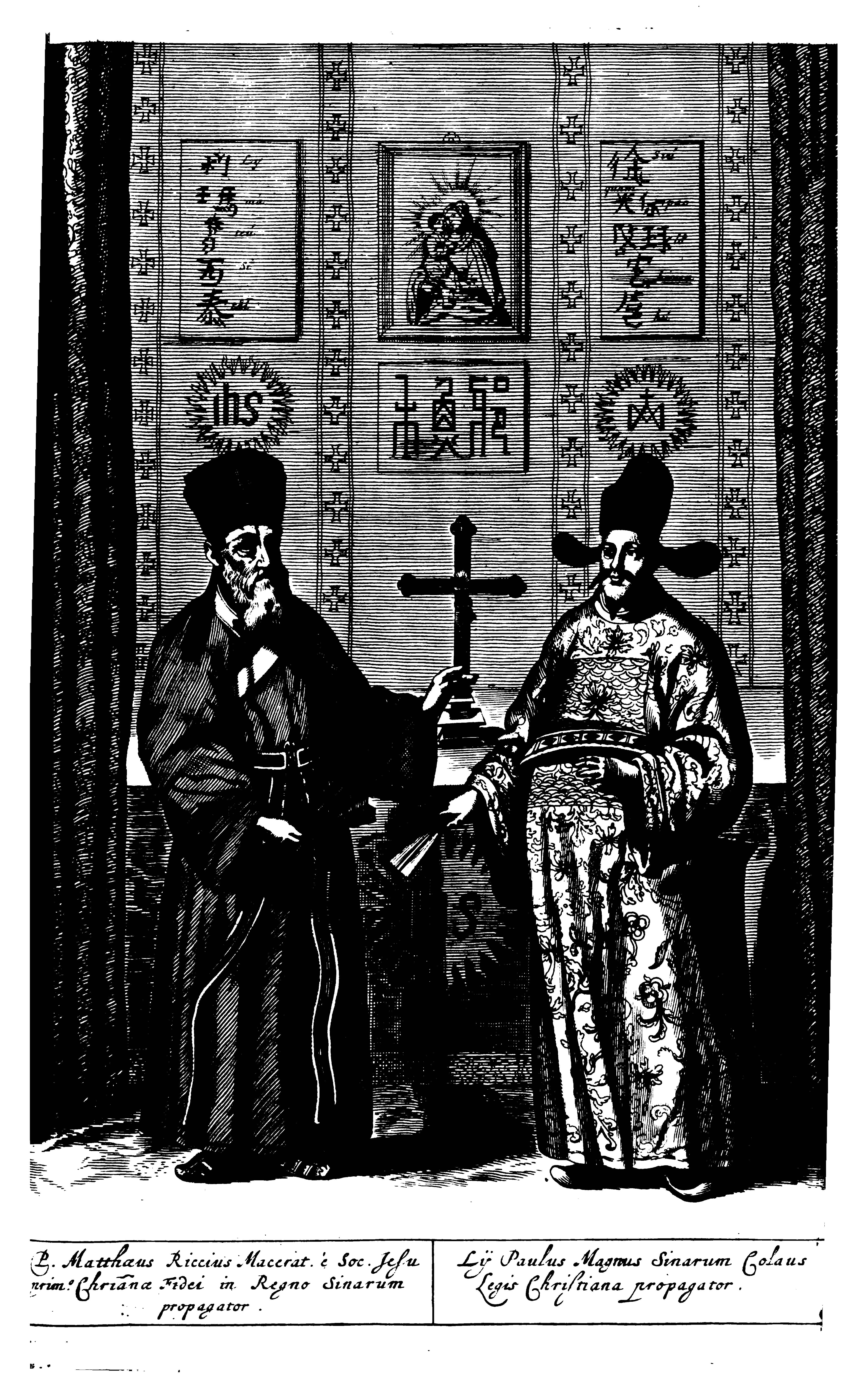 Abb. 3: Matteo Ricci und Xu Guangqi. In: Athanasius Kircher: China Monumentis Qua Sacris quà Profanis, Nec non variis Naturae & Artis Spectaculis, Aliarumque rerum memorabilium Argumentis Illustrata, Amsterdam 1667.