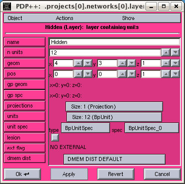 The object-based structure of PDP++ models is strongly reflected in the system's graphical user interface. While this interface contains a number of tools specifically designed to ease the most common model construction and analysis tasks, virtually every object in a model may also be directly examined and modified through the use of default object editing windows. These editing windows are automatically constructed using class structure information. This makes them somewhat generic and often cluttered with rarely modified information, but it allows virtually all of the objects that make up a simulation to be modified through a forms-based graphical interface. The TypeAccess system allows these editing windows to do dynamic type checking, keeping users from modifying objects in grossly invalid ways. TypeAccess also extracts comments from the underlying C++ source code, and this allows editing windows to contain short online help messages describing the various components of each object, based on the source code comments. Thus, even a generic editing window of this kind includes some guidance concerning the structure of the object being edited and the meaning of its various fields. An example generic editing window, for a layer object, is shown in Figure 1.