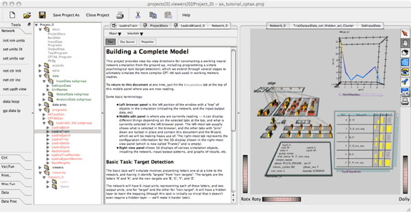 The foundational structure of PDP++ has not changed much in Emergent, with simulations constructed from collections of objects, such as network objects, environment objects, and the like. Object editing dialogs continue to exist in the new version, offering a graphical means to inspect and modify the various components of any object in the system, as before. The basic organization of the graphical user interface has changed in Emergent, however. In PDP++, separate windows are used for each interaction with the system. For example, editing three different layer objects would typically produce three object editing windows, one for each layer object. This user interface design can result in a large number of windows without any apparent overarching organization. Emergent attempts to impose some structure on simulation projects by introducing an extensive Project Viewer Window. This large window contains multiple panes, laying out common components of a simulation in a manner that avoids occlusion. Rather than generating many different windows for interacting with various objects, the active dialogs are "stacked" within the panes of the Project Viewer Window and are accessible through "tabs" at the top of each pane. Thus, selecting a "tab" brings the desired dialog to the top of the stack. A menu option allows any of these dialogs to be separated from the Project Viewer Window and placed in its own window, but the default behavior of the interface is to avoid the creation of such stand-alone windows. An example Project Viewer Window is shown in Figure 10. As displayed in that figure, the Project Viewer Window contains three main panes, arrayed from left to right. On the left is a pane that offers functionality similar to that provided by the PDP++ Project View Window (Figure 4). A pallet of tools is offered in this pane alongside a hierarchically organized listing of all of the objects in the project. This listing assists the user in quickly finding any specific object of interest, allowing the object to be inspected or modified. The middle pane contains a stack of control panels, editing dialogs, and other tools for interacting with the current simulation. Importantly, as shown in Figure 10, this pane can include embedded documents, as described below. The rightmost pane is used for graphical displays, including those that previously appeared in the PDP++ Network View Window (Figure 6) and those that previously appeared in various PDP++ log view windows (Figure 9). The graphical capabilities of Emergent are much more extensive than those of PDP++, as discussed below.