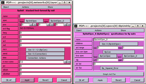 In many connectionist modeling frameworks, some parameters and features of a model component are relatively static and others are highly dynamic. For example, a processing unit's maximum possible activation level does not typically change during the course of model simulation, and this upper bound is typically shared by all of the units in a layer or in an entire network. Conversely, the activation level of each unit is typically highly dynamic, changing radically over the course of each event and changing in different ways for different units. PDP++ leverages this distinction between rarely changing shared parameters and more dynamic variables through its inclusion of specification objects, or specs. Each spec contains a collection of fairly static parameter values for a particular kind of network component. Thus, a unit spec contains information about the maximum activation level, while a unit object, proper, contains the unit's current activation level. This organization allows spec objects to be shared, when appropriate. For example, all of the units in a network can make use of the same unit spec object, allowing the user to change the maximum activation level of all units in the network simply by modifying that single unit spec object. Example editing windows for a unit and for a unit spec are shown in Figure 2.