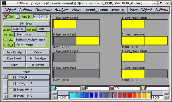 The second method for producing a PDP++ environment involves use of the system's graphical user interface to manually construct events. The PDP++ Environment View window, shown in Figure 3, allows users to populate an environment object with individual events and to specify the input and output activation values for each of those events. Using a kind of "painter's palette" at the bottom of the window, users can select an activation level and then "paint" the input and output values for different events with that level. This process of manually constructing events is easy and appropriate for environments containing a small number of events, but it can become tedious and error-prone when large environments are needed.