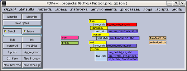 There are a number of graphical interface tools that are worthy of special mention, as they play central roles in the design and operation of PDP++ simulations. One such tool is the Environment View Window, which was previously discussed. Of the other important tools, the highest level one is the Project View Window. This window provides an overview of an entire model simulation, collecting and organizing all of the key objects that make up that simulation. This tool also provides an array of menus for creating and modifying the primary components of a simulation, including: specs, networks, environments, processes, and logs. An example Project View Window is shown in Figure 4.