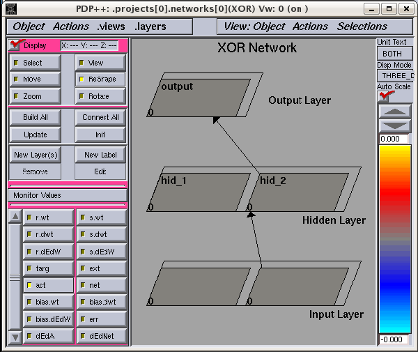 The main tool used to construct and examine connectionist network models in PDP++ is the Network View Window. The central pane of this tool displays the network architecture, and various properties of the network can be displayed in an overlayed fashion on this architectural diagram. An example Network View Window is shown in Figure 5. By default, layers of processing units are displayed as large rectangles, with each unit displayed as an embedded square. Collections of connections between layers, called projections, are displayed as arrows between the connected layers. These projections are often "complete" in that every unit in the sending layer is connected to every unit in the receiving layer, even though only one arrow is displayed between the layers, but projections can also involve random or structured patterns of connectivity between layers. By default, the network architecture is displayed in a form of 3D perspective, with layers stacked one above the other.