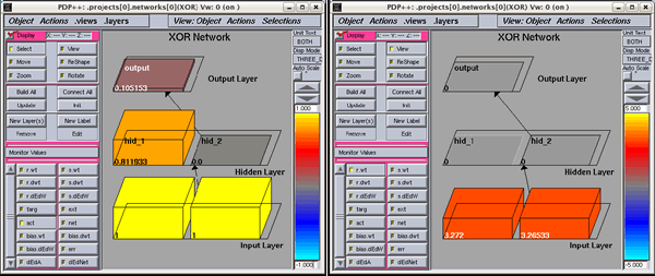 Numeric properties of a network can be graphically displayed on the network architecture diagram. For example, values associated with individual processing units, such as their current activation level, their current net input, or their current backpropagated error (delta) value, can be graphically superimposed over each displayed unit. The way in which these values are displayed -- textually, through the height of a bar, through the degree to which a square is filled, through a color-coded scale, or through some combination of these -- is under user control. For example, Figure 6(a) shows the display of unit activation values encoded textually, through the height of individual unit columns, and color-coded according to the scale on the right side of the window. Variable values associated with connections are more difficult to display on the network architecture diagram, as there are typically many more connections than units in a connectionist network. PDP++ resolves this problem by allowing for the display of connection-specific values, such as connection weights, only for connections associated with a selected unit, at any one time. Figure 6(b) shows an example of this, with the connection weight values received by Hidden Unit 1 displayed as text, column height, and color-coded according to the scale on the right edge of the window.
