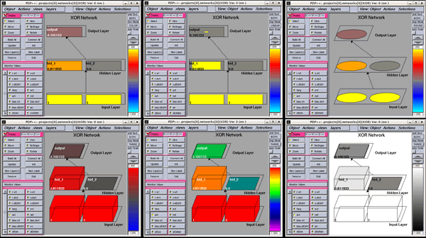 PDP++ offers much fiexibility in the way in which quantitative information is displayed in the Network View Window. The perspective view on the network can be flattened. Graphical bars can take on various shapes. The numerical value associated with a unit can be encoded by the degree to which that unit's square is filled, as is done in Hinton diagrams. The user may sample from a range of color scale options, and custom color scales may also be created. Some examples of customized network diagrams are shown in Figure 7.