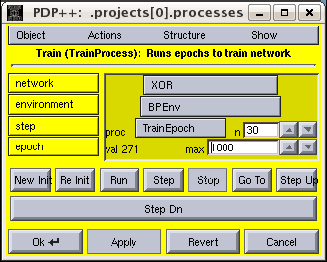 While the Network View Window contains most of the instruments necessary to construct and examine a connectionist network model, the step-by-step execution of the algorithms for activation propagation and connection weight learning is orchestrated by a hierarchy of objects called process objects. Different process objects control the timing of the simulation at different levels of granularity, with some coordinating the settling of the recurrent flow of activation through the network, while others operate at the level of event presentations, and still others function at the level of complete passes (i.e., epochs) through entire sets of training events. The organization of the hierarchy of processes is one of the more complicated aspects of PDP++, and many students have difficulty initially grasping the role of these objects. In order to ease the use of process objects, PDP++ provides special windows for performing the most common operations on processes. These windows are called control panels. An example control panel for a training process is shown in Figure 8. This example control panel allows the user to change the training environment object being used for training. The user can also specify the maximum number of training epochs to be executed. Buttons near the bottom of the window allow the simulation to be initialized, to run the simulation, and to step through the simulation one epoch at a time. Thus, the actual execution of the simulation can be completely controlled through the use of process control panels.