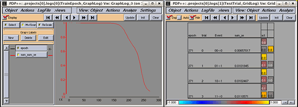 As network simulations are run, it is often useful to display measures of network behavior and performance. In PDP++, this is accomplished through the use of log objects and their corresponding view windows. Log objects typically record sequences of statistic object values, and present those sequences in some easy-to-read form. The most basic kind of log is a simple textual log, which consists of columns of textual, often numeric, data. Such tables can be displayed in a window in the PDP++ interface, and they can be written to plain text files. Additionally, the PDP++ web site contains a number of tools for parsing log files and converting them into other formats. Some quantitative data are best viewed as a line curve over time, and PDP++ supports such displays through its Graph Log objects. The kinds of data displays provided by the Network View Window, organized by network layer, are also sometimes worth recording, so PDP++ provides Grid Log objects to display data in a format similar to that shown over grids of processing units. More sophisticated log objects are also provided to perform calculations on collected data, such a principal component analysis and hierarchical clustering of vectors. Some simple example log views are shown in Figure 9.