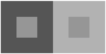 Figure 1: The surrounding context impacts our perception of brightness. The reference and the target inner square patches are the same shade of gray.