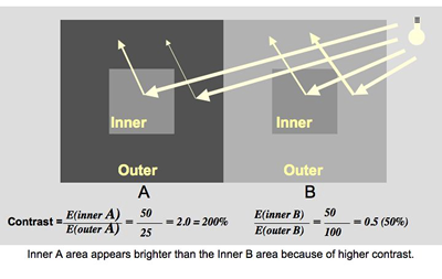 Figure 2b: Brightness perception illusions are based on the brain’s ability to calculate local contrasts and compare them across the visual field. Since Contrast A > Contrast B, it appears brighter.