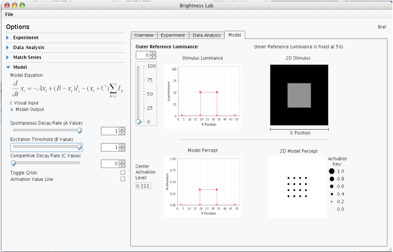 There are two areas that call for a problem-solving approach to mathematics. First, integrated with use of the Brightness Lab software, a formal lab report helps students structure and assess their thinking as they collect experimental data about themselves, create visual displays of the quantitative data, and perform statistical analysis and interpretation. Second, a neural network model of brightness perception (see Figure 3) uses an ordinary differential equation to characterize the rate of change in neurons that leads to brightness perception.