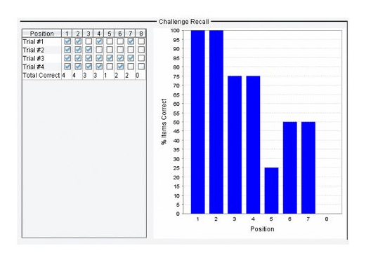 Module activities in the class include consideration of the issue: why can't we store arbitrarily long sequences in working memory? The question of why is there a natural upper bound on how many items can be stored at the same time [9] is explored in the software component for span testing. Students perform exercises where they generate the primacy effect where the initial items in a list are remembered better than later items (see Figure 5). The primacy effect is the first part of the common inverted-U performance profile related to serial position during free recall of the temporal order of list items. Students learn that this limitation reflects how the specific neural activities related to item-and-order memory change when new items come in. However, with longer lists there is also a recency effect where the last items in a list are remembered better than pervious ones. The recency effect completes the inverted-U performance profile and implies that that the items do not get stored with a primacy gradient all the time. Why is this? To have a long-term memory that retains a true representation of order information, we can only store relatively short lists in working memory at any given time. To be established in long-term memory, the short lists must typically be rehearsed. Longer lists in working memory would cause an inverted-U that would be transferred to long-term memory. Therefore, working memory and long-term memory are specialized such that they complement each other to provide rapid new learning along with stable old learning. Students are encouraged to develop these conceptual models of how our brains may be storing sequences of information in a working memory. One important constraint on how brains perform this task is that whenever we are actively thinking about an item in working memory, there is a specific location or network in the brain where that item is being represented. At least two possibilities exist for theories of how items in a sequence are stored within our working memory: positional models [10] and ordinal models [11].