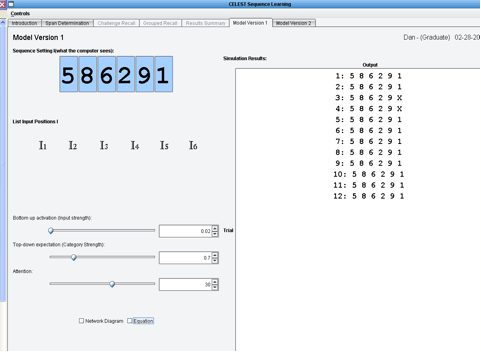 Students are guided through the construction of the neural network model using an introduction to terminology, graphing symbols, and typical neural interactions of feed-forward and feedback excitatory and inhibitory connections. Directed experiments with simulations using the model layer are provided on two levels. Level 1 is a conceptual use of the model, and simulations are comprised of the manipulation of three parameters (bottom-up activation, top-down expectation and attention) to see how these impact the ability of the model to learn a given sequence of digits (see Figure 6). Level 2 includes a complex network diagram, and the actual differential equations that support the outcomes of the model; 6 parameters are exposed. The Sequence Learning neural network model that is active in the software is an ordinal model called LISTPARSE (Laminar Integrated Storage of Temporal Patterns for Associative Retrieval, Sequencing and Execution [12]) which explains and quantitatively simulates cognitive data about immediate serial recall and free recall, including bowing of the serial position performance curves, error-type distributions, limited temporal extent for accurate recall, and word and list length effects.