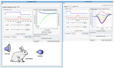 The third level of the module uses the study of eye-blink conditioning to develop a deeper understanding of the types of memory. The eyeblink response, measured by eyelid movement in rats, cats, monkeys and humans, and the movement of the nictitating membrane (NM) that covers the eye like an eyelid in rabbits, has been extensively studied because it has given excellent parametric behavioral, neurophysiological and anatomical information about the learning and memory processes related to associative conditioning. There is a complete model layer based on published research [14] that simulates the NM response as measured by the timing and amplitude of its movement and the cerebellar response that supports the behavior. The software simulation is comprised a multi-dimensional GUI interface with adjustable parameters such as the conditioning paradigm, the onset/offset times of CS and US, the learning and extinction rates, and number of Purkinje cells in the network (see Figure 7).