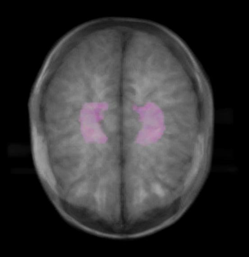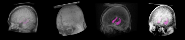 Figure 3: When the atlas is started only segmented atlas pixel values of 37-38, this encodes for the left and right hippocampus in the original data. The T1 MRI’s transfer functions (opacity and color) are set to display values corresponding to parts of the skull and the grey matter.