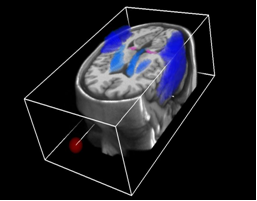 Initially, the addition of both volumes to the visualization pipeline caused the T1 data to completely occlude the segmentation data, even if the T1 had a lesser opacity factor (or vice versa if the segmented volume was added first to the pipeline). This was rectified by the generation of two rendering layers, adding both volumes to both layers and allowing VTK to composite the layers into a single viewport. This technique seems to work well with multi-channel visualizations, and allows any given pixel to be dependant on the summation of all underlying data from both rendering layers. Effectively, this means that if an anatomical region has a greater opacity value than the overlying MRI, it is visible inside the MRI (Figure 2a), otherwise it is occluded by the T1 (Figure 2b).
