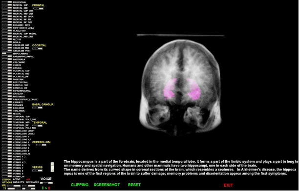 In summary, the volume rendered brain atlas incorporates realtime rendering with an intuitive interface and almost no learning curve. Both structure and function are incorporated into the software and provide a multimedia educational experience that could be of use to a wide audience with varying degrees of prior knowledge of the human brain.