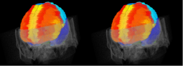 Figure 7: This is an example of the snapshot function in the software. The application generates 2 images that represent the right and left stereoscopic views of the visualization. In this particular image, the 2 snapshots have been placed side-by-side to allow the user to use the cross-eyed viewing method to passively view the image in 3d. Stare at the point between the two images and slowly cross your eyes; the image in the center will be in stereoscopic 3d. In this image the enitre brain atlas is visible, and a portion of the T1 clipped.