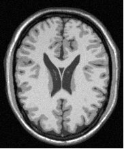Figure 1a-b: These images display a single plane from both the segmented (a) and T1 (b) data. In the segmented image, a number of different grayscale values are visible that represent specific anatomical regions. The corresponding T1 image gives a frame of reference from a more familiar view of the brain. Each image is from the same plane of the brain.
